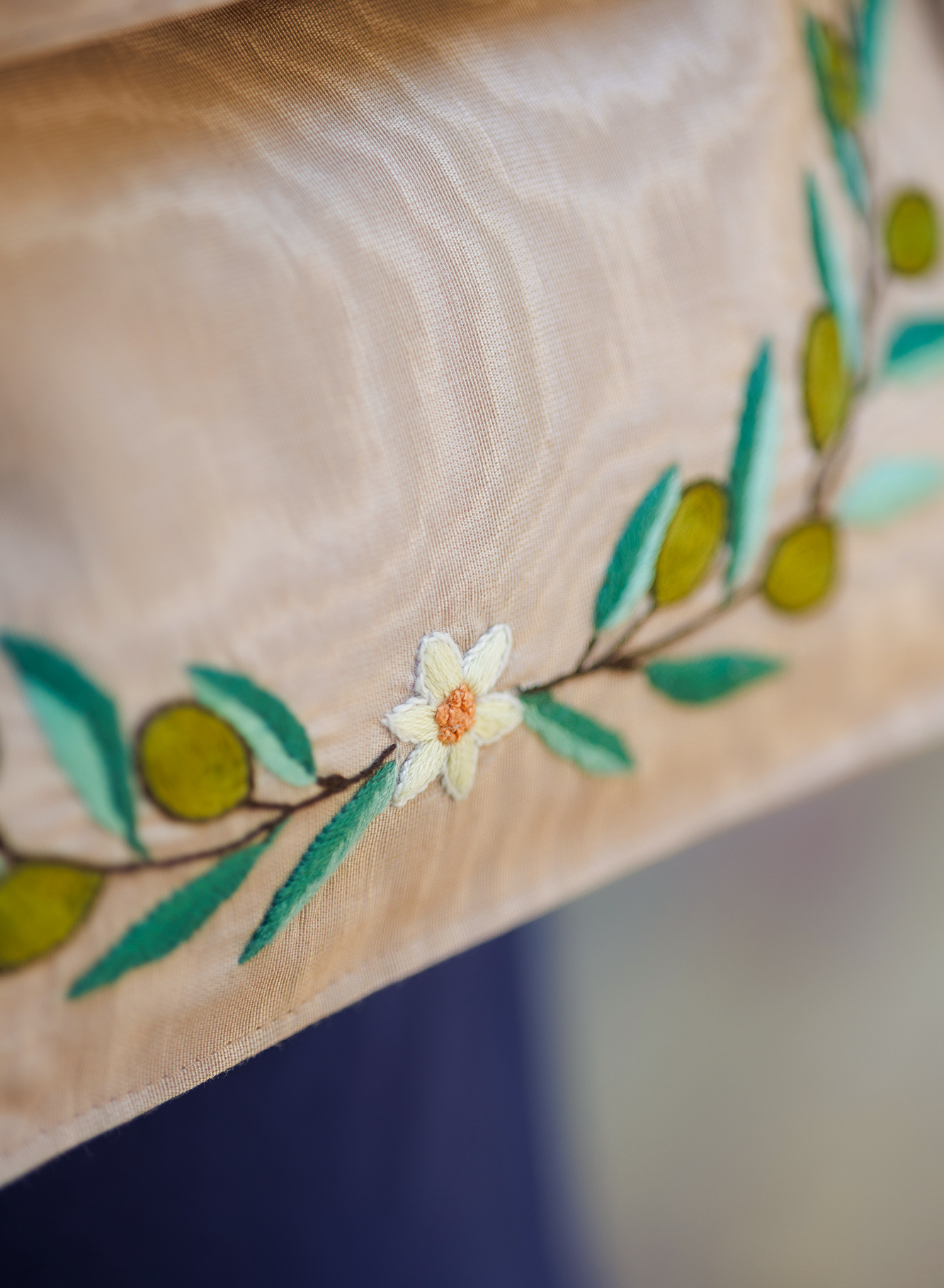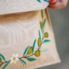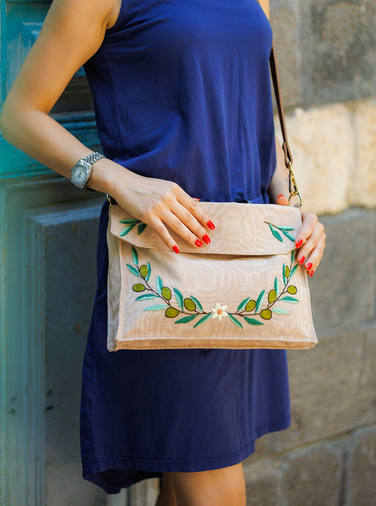The intricate cotton thread embroidery captures the vibrant green of the olives, a symbol of peace, prosperity, and the natural beauty of the land. It’s perfect for daily use, whether you’re headed to brunch, a city stroll, or daily work.
