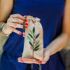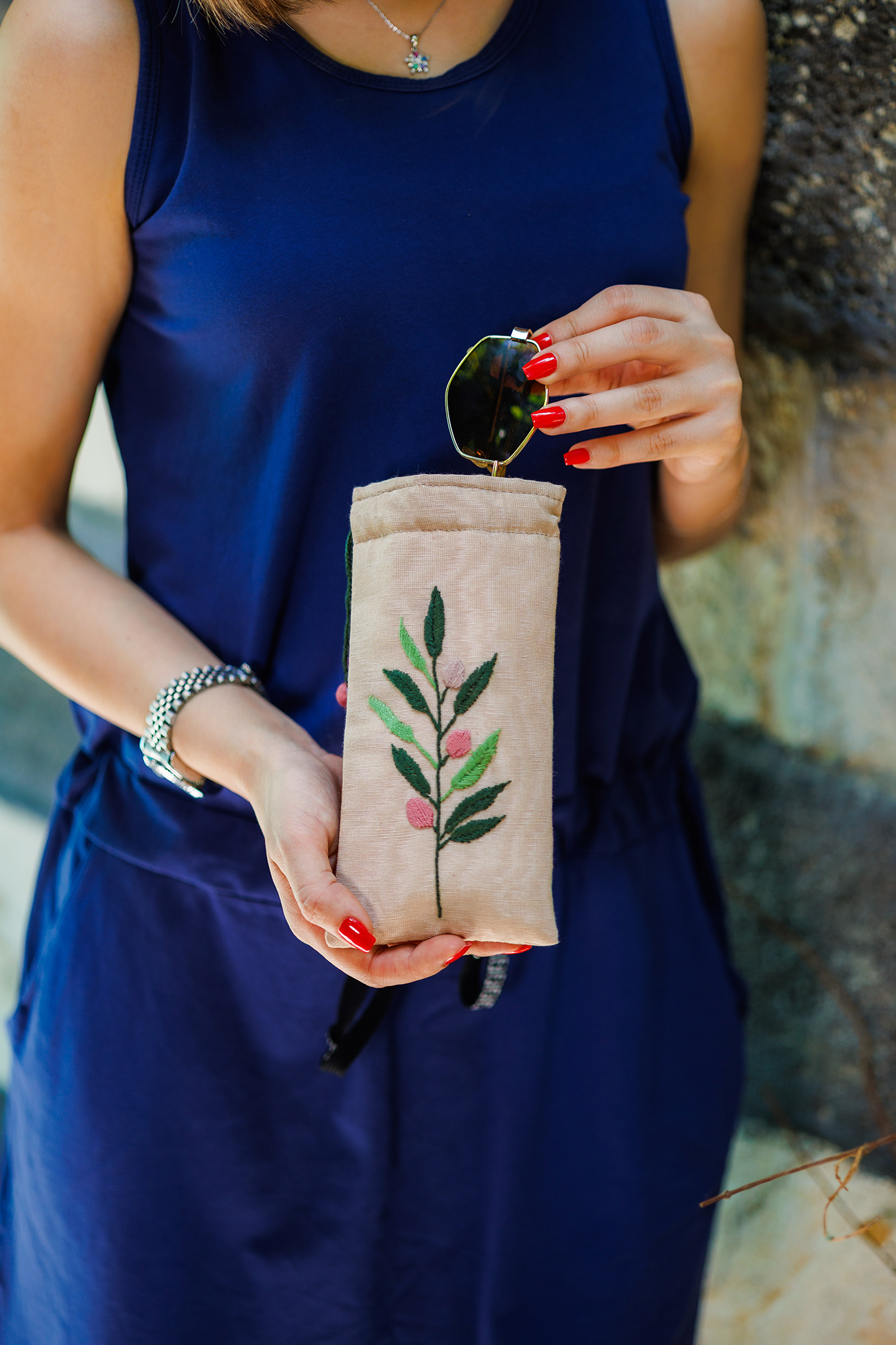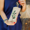 This glass pouch is from our Idelbi collection which inspired by the exquisite olives of Idleb, a region in Syria known for its rich olive groves. The intricate cotton thread embroidery captures the vibrant green of the olives, a symbol of peace, prosperity, and the natural beauty of the land.