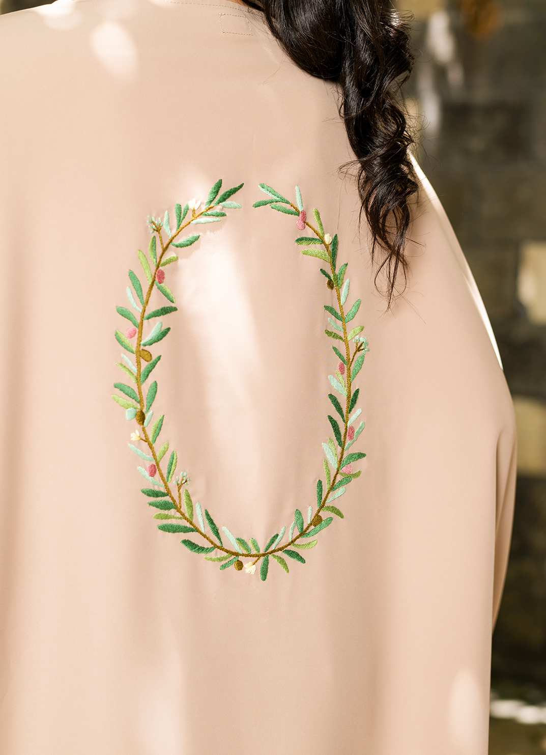 Discover the perfect fusion of timeless tradition and modern sophistication with our Beige Idelbi Jacket, a hand-embroidered masterpiece meticulously crafted by talented Syrian women. This flowing silhouette features a delicate olive branch wreath embroidered on the back, inspired by the abundant olive groves of Idleb, a Syrian region celebrated for its agricultural richness and cultural heritage where we inspired our Idelbi collection.