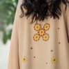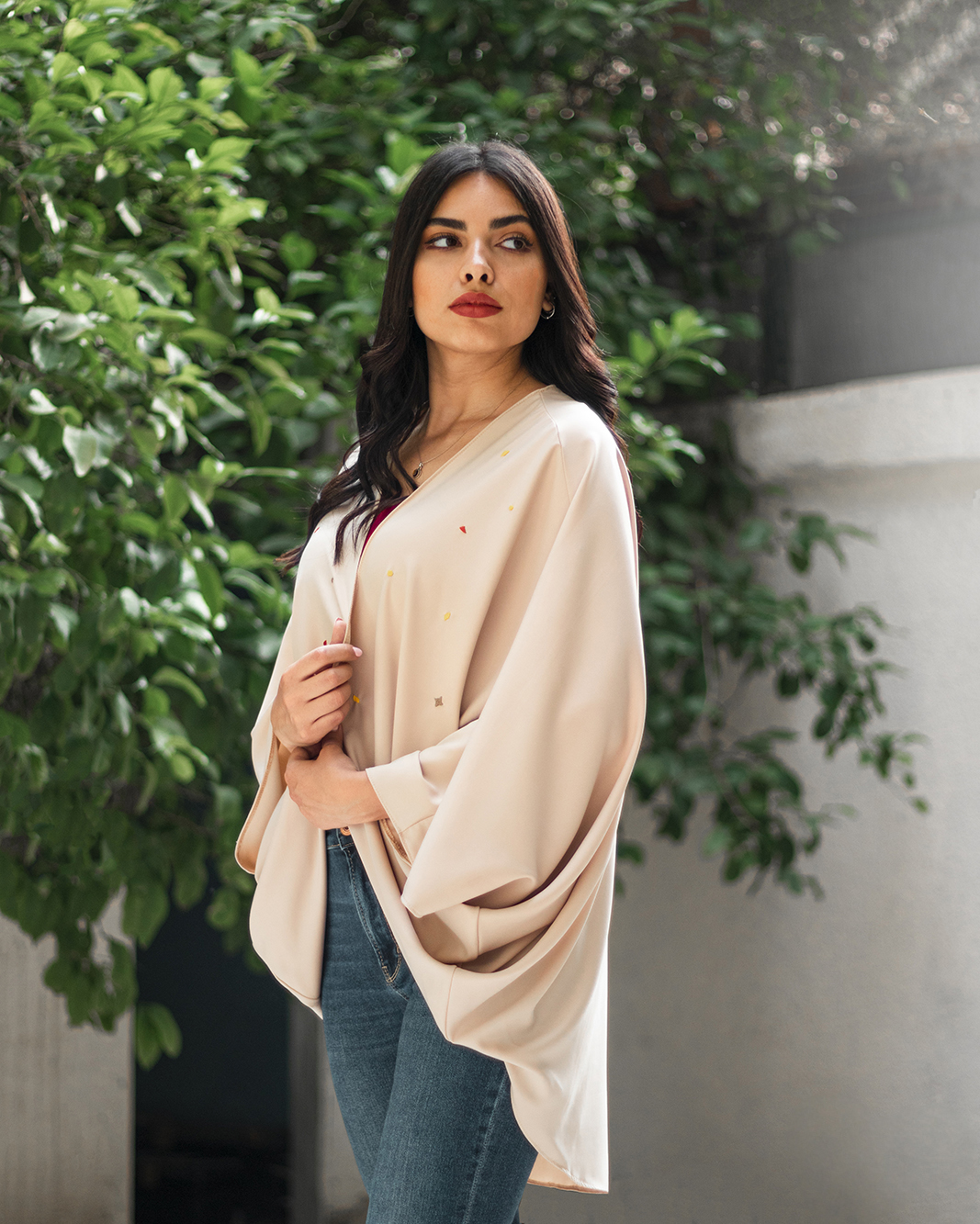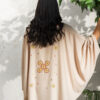 This free-size jacket fits small, medium, and large sizes. The model in the photos is a medium. This piece features a relaxed silhouette that drapes gracefully, offering a flattering fit for any body type. The crafted embroidery is meticulously warm hues, where we tried to create a striking contrast against the soft beige backdrop. Perfect for transitioning from day to night, this versatile jacket can be styled up or down to suit any occasion. Pair it with sleek trousers for an elevated look or throw it over a casual dress for a touch of sophistication. Embrace your free spirit and make a statement with this timeless garment that blends traditional craftsmanship with contemporary design.