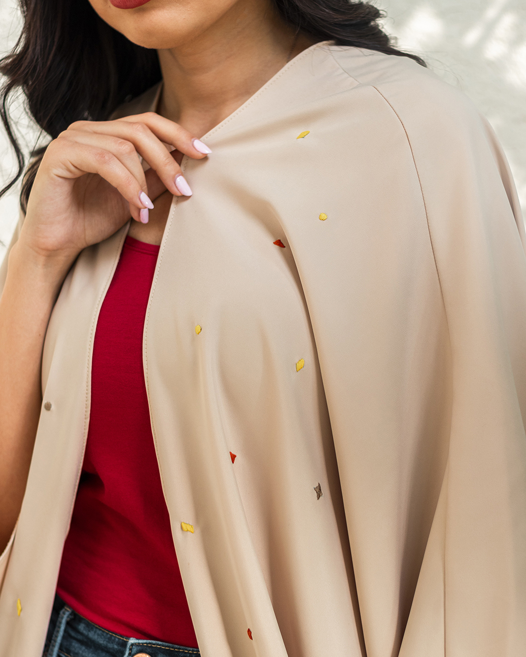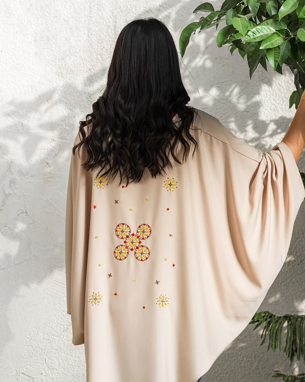 Unleash your inner boho goddess with our enchanting Beige Mosaic Jacket, where vibrant hand embroidery meets effortless elegance. This chic jacket boasts a mid-length cut, gracefully extending just past the waistline. Its elongated sleeves add to the relaxed, oversized fit, creating a flowing silhouette that exudes effortless style. Its open-front design, free from buttons or zippers, offers unparalleled freedom and effortless style, creating a relaxed and breezy vibe.