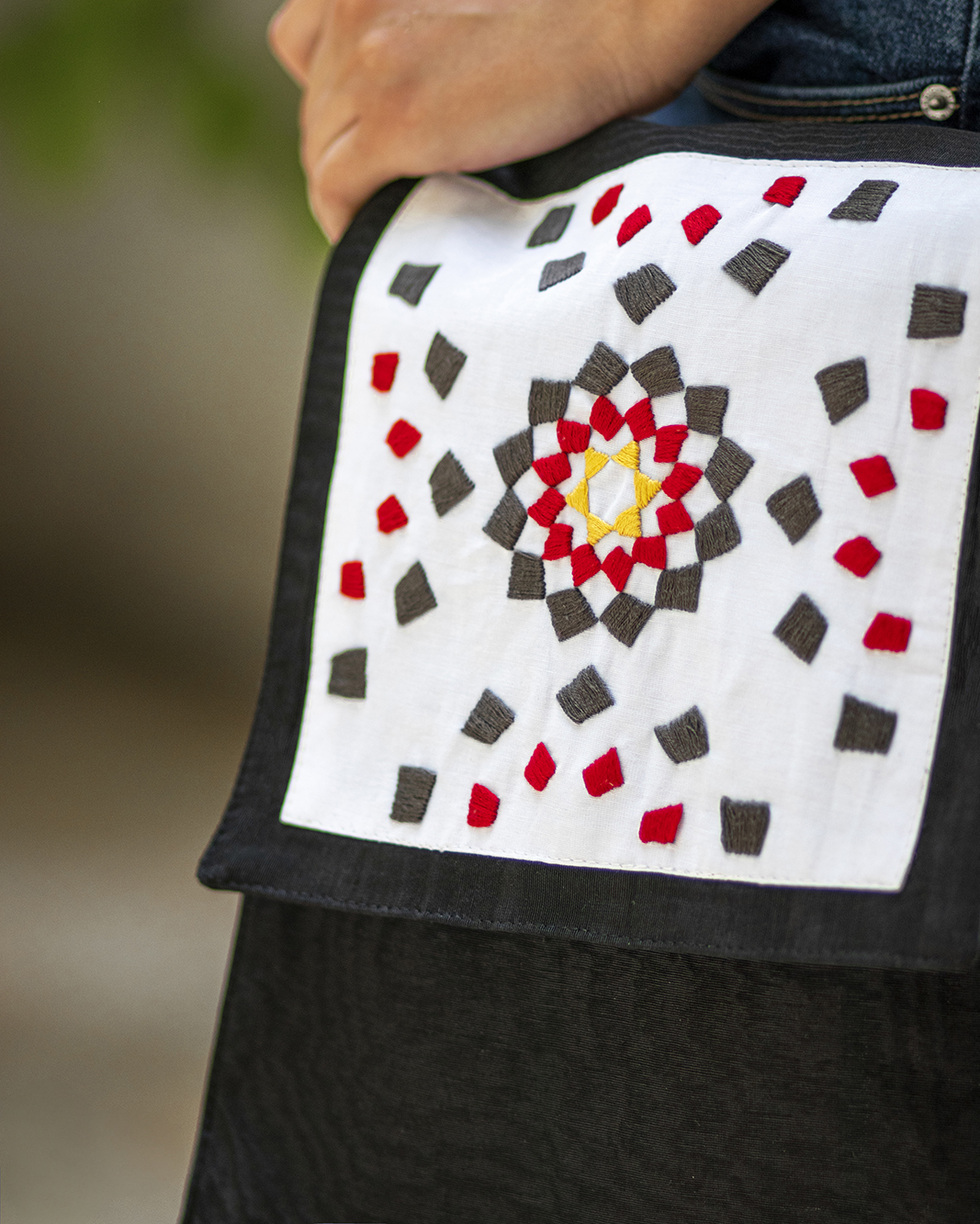 Transform your daily routine with the elegance of artisanal craftsmanship. The Black Mosaic Bag features artistic hand embroidery made by the talented women of Sama. It has a comfortable shoulder handle. For better organization, it includes a partition and a small zipper pocket. The cover has a magnetic snap button for secure closure. The embroidery color tones are rich, deep emerald, and reminiscent of a lush.