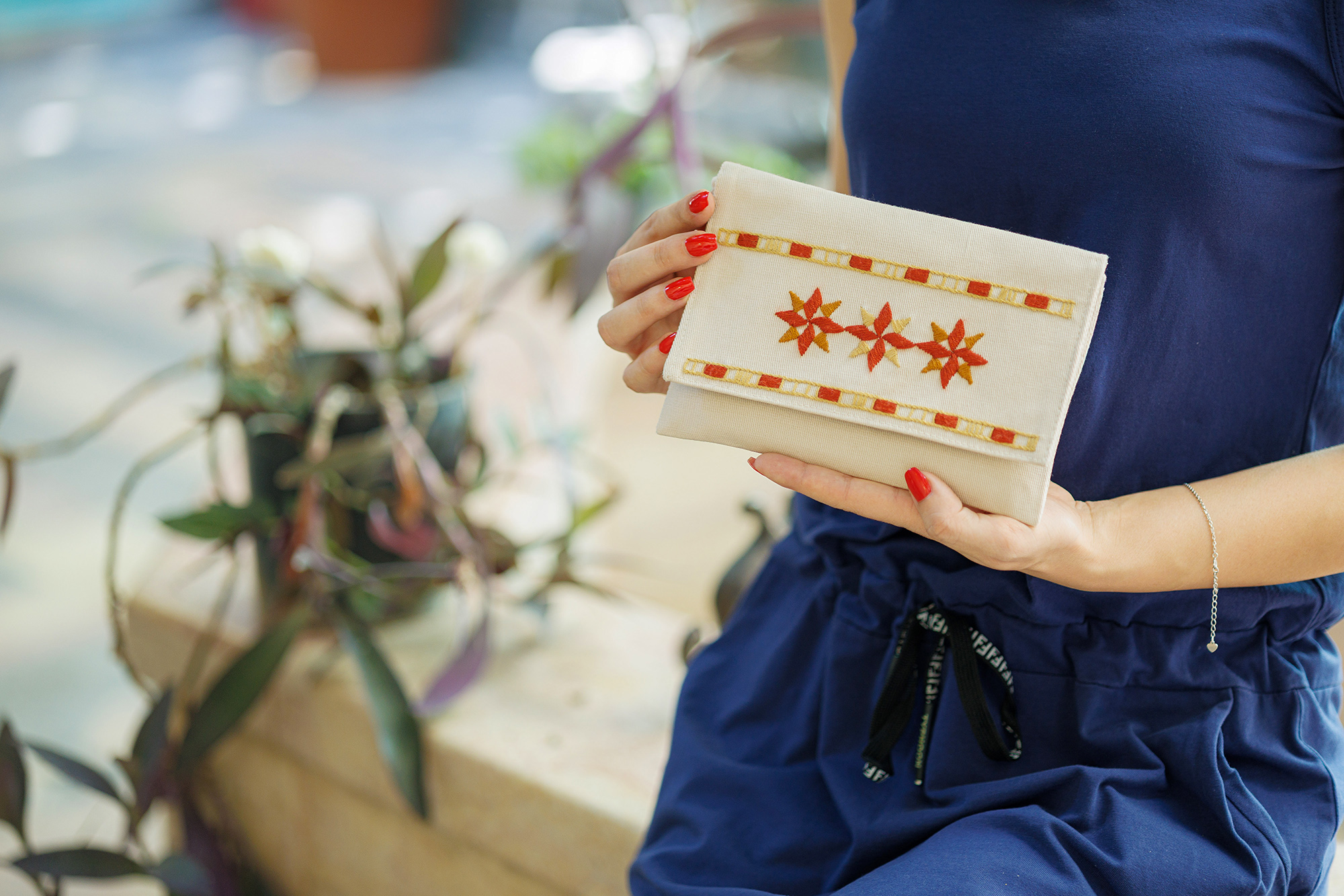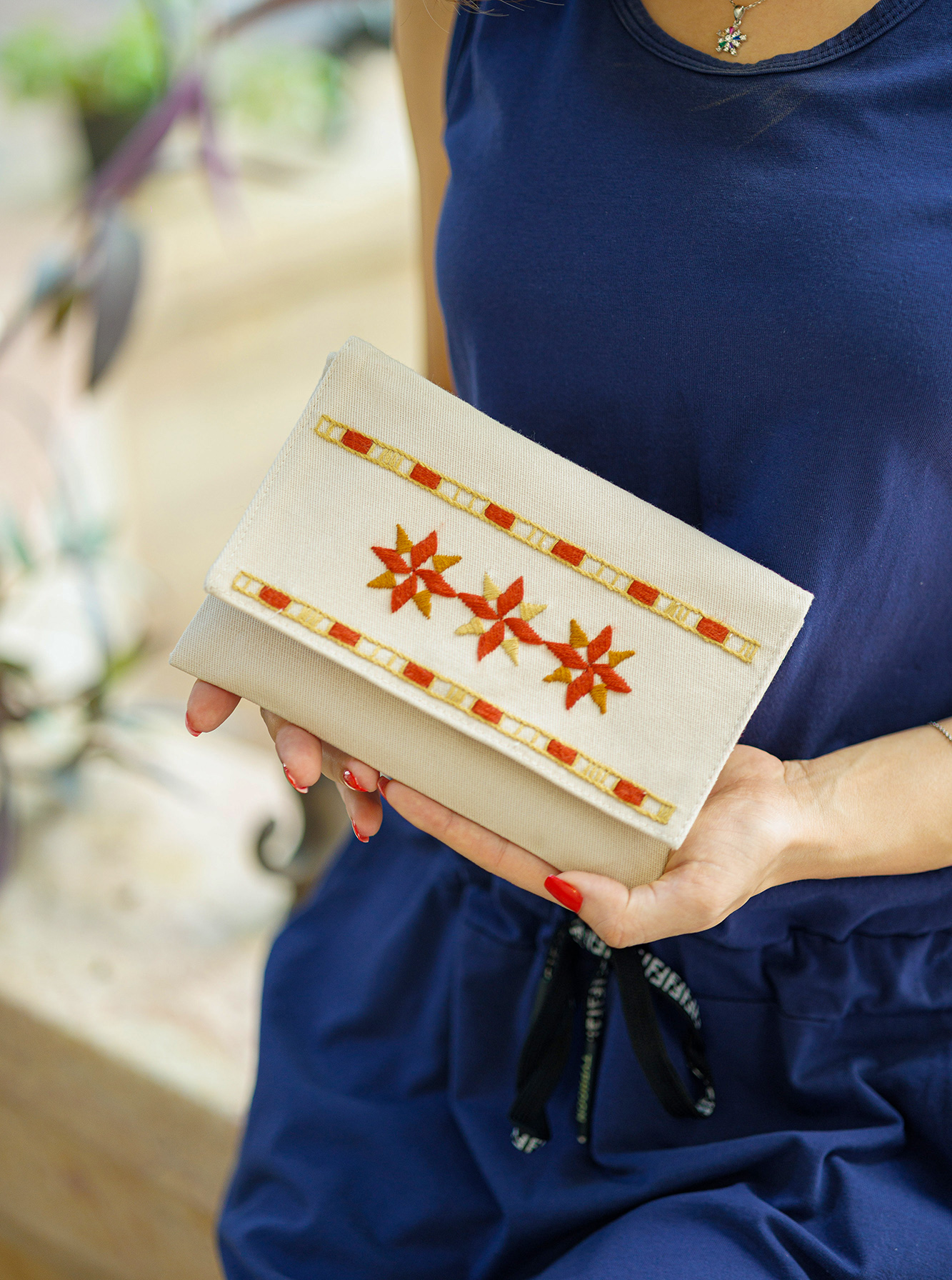 Crafted from high-quality cotton fabric, this pouch boasts a soft, yet remarkably durable finish, making it both practical and aesthetically pleasing. The detailed hand embroidery, featuring delicate stitching in warm, earthy tones, embodies tradition’s grace and resilience. Each stitch tells a story, making this pouch a piece of wearable history that effortlessly introduces a touch of refined sophistication to any outfit.