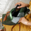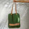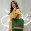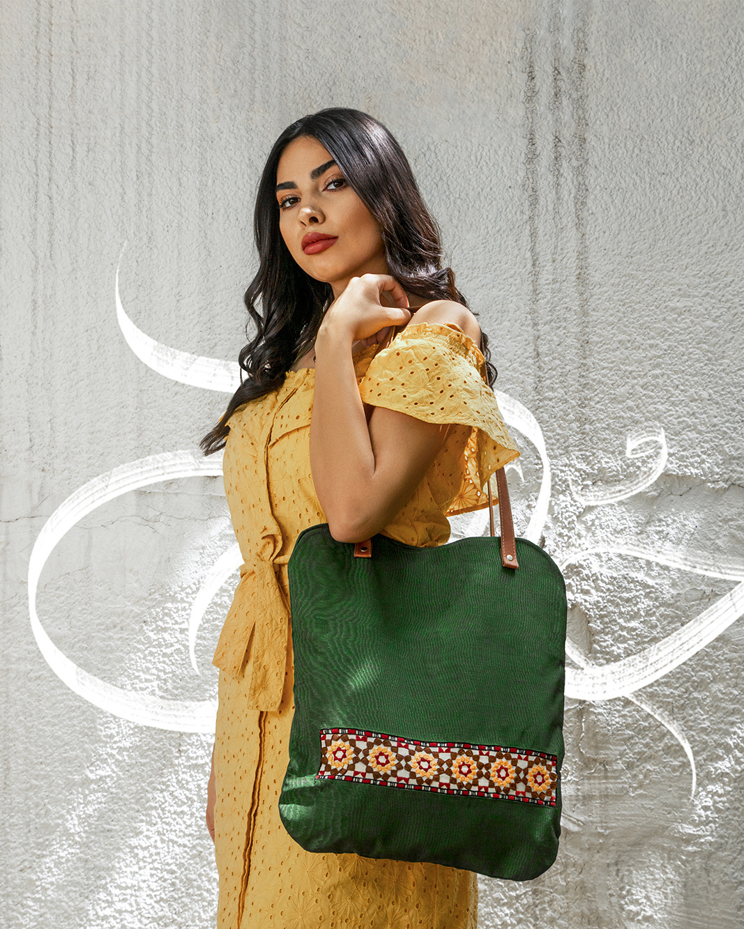 Elevate your everyday with handcrafted luxury. The Olive Mosaic Bag features artistic hand embroidery made by the talented women of Sama. It has comfortable double shoulder handles. For better organization, it includes a partition and a small zipper pocket. The top has a magnetic snap button for secure closure. The olive color tones are a rich, deep emerald, reminiscent of a lush, Idleb olive grove.