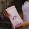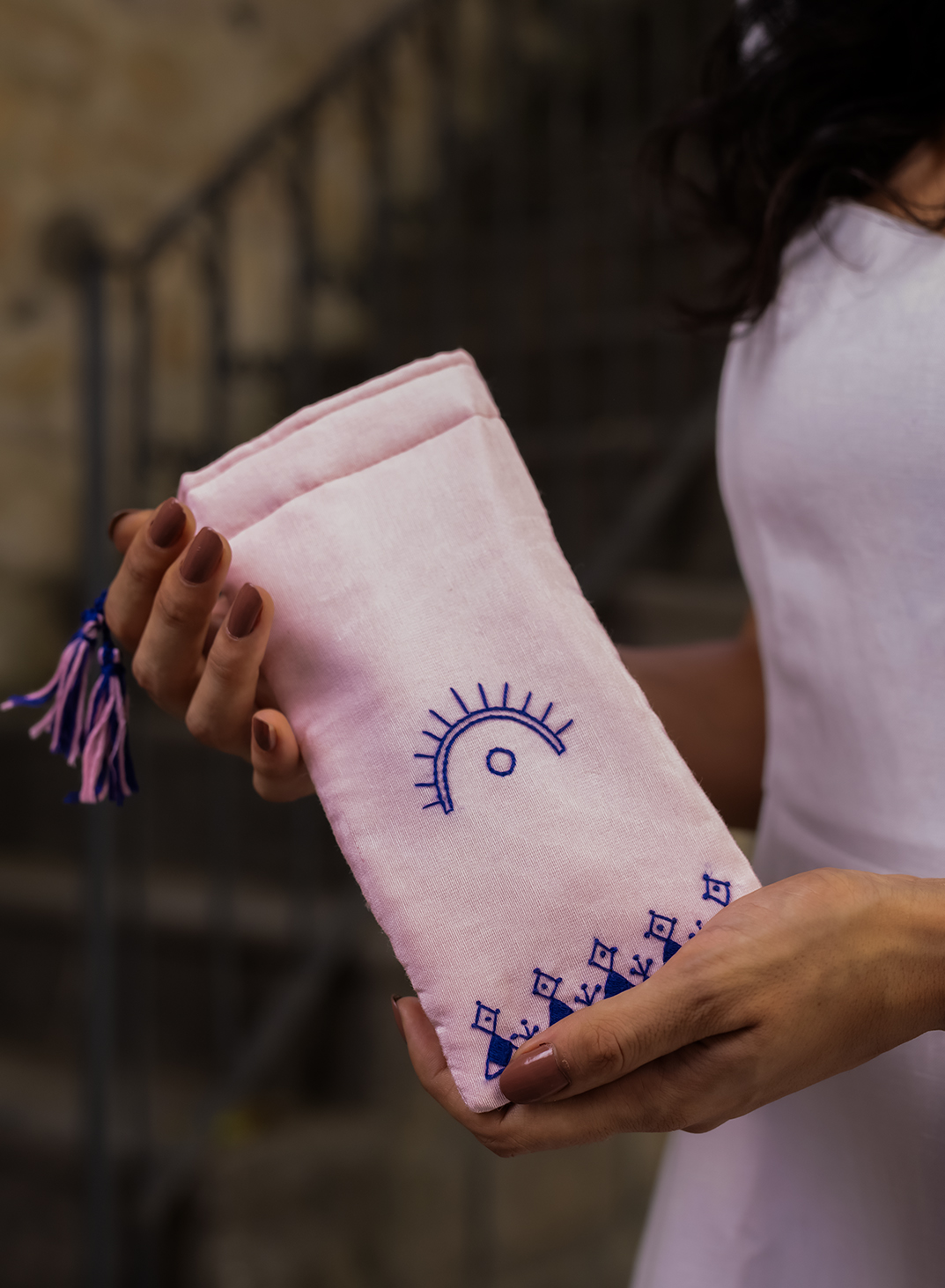 Crafted from soft, durable cotton with a smooth finish, the pouch is designed with both beauty and practicality in mind. The embroidery—stitched in deep navy against a delicate pink background—evokes protection, resilience, and cultural pride, making it more than just an accessory.