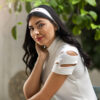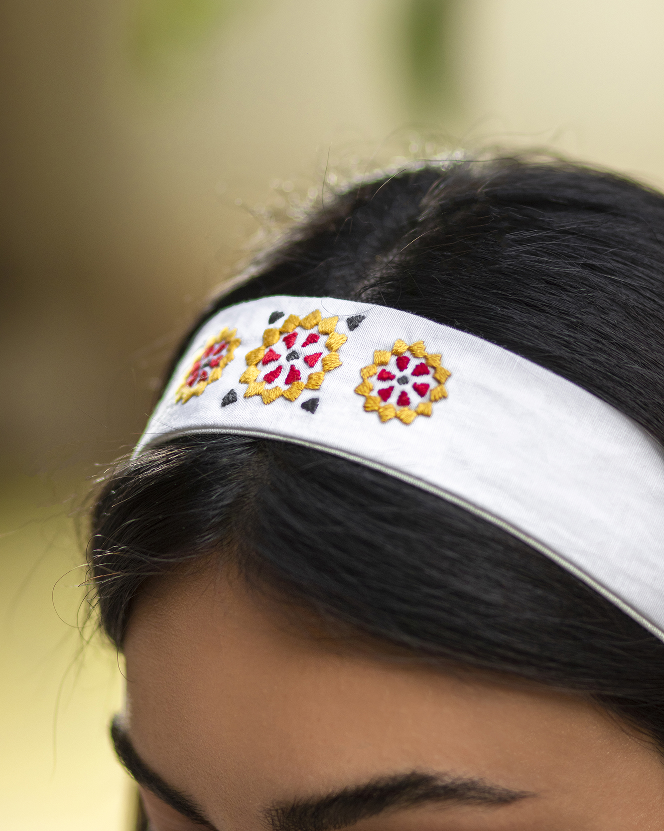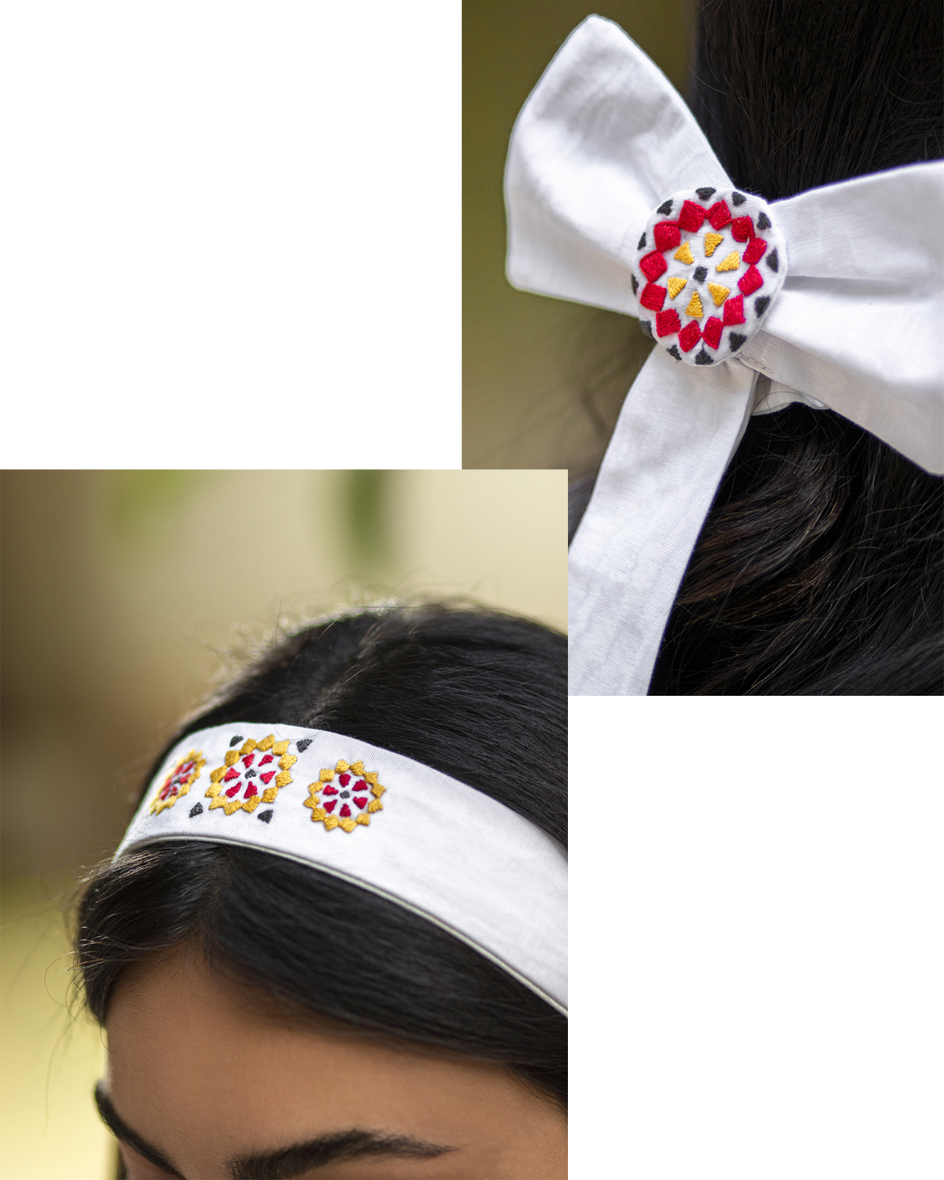 This set is from our Mosaic collection, Hand embroidered from natural cotton threads. This elegant tie hair gives your hair elegant touch and holds it up the way you like it.